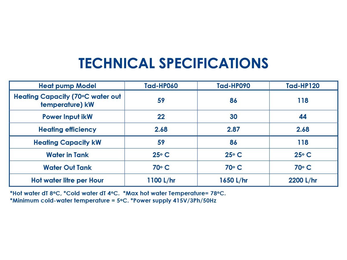 The TAD heat pump is a water-to-water, high-efficiency 75oC water heating machine with cold water output.
